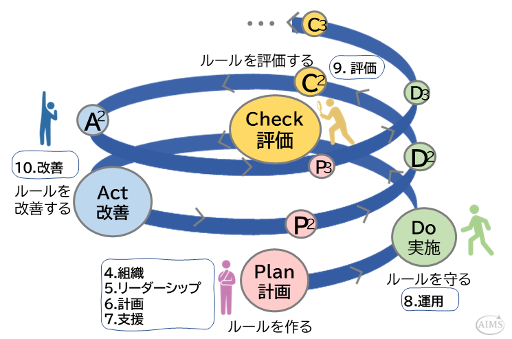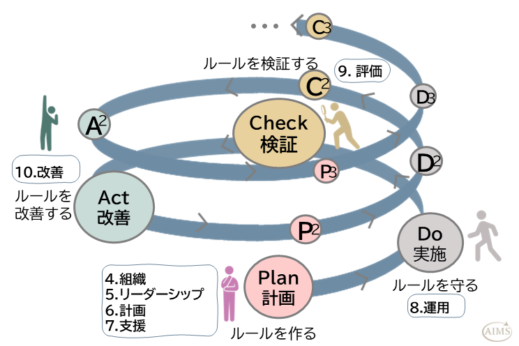 ルールを作って(Plan)、ルールどおりに実施し(Do)、ルールが守られているかどうかをチェックし(Check)、ルールをさらによいものへと改善させて(Act)いきます。