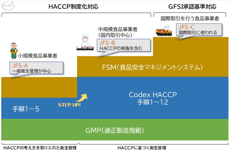 - また、日本初のHACCP認証制度「JFS」への取り組み方、JFS-A、JFS-B、JFS-Cの違いについても理解しておきましょう。