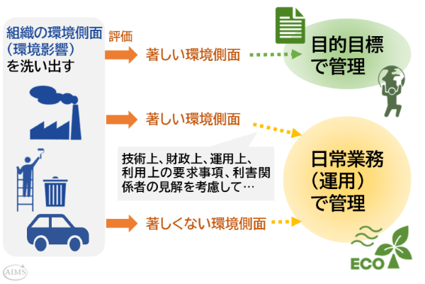 また、著しい環境側面であっても目標管理が難しい場合もあります。その場合は、日常的な業務の中で、なるべく環境側面を削減する努力や現状維持を行うようにします。環境への影響を0にはできなくても、自社の環境影響については認識しておきましょう。